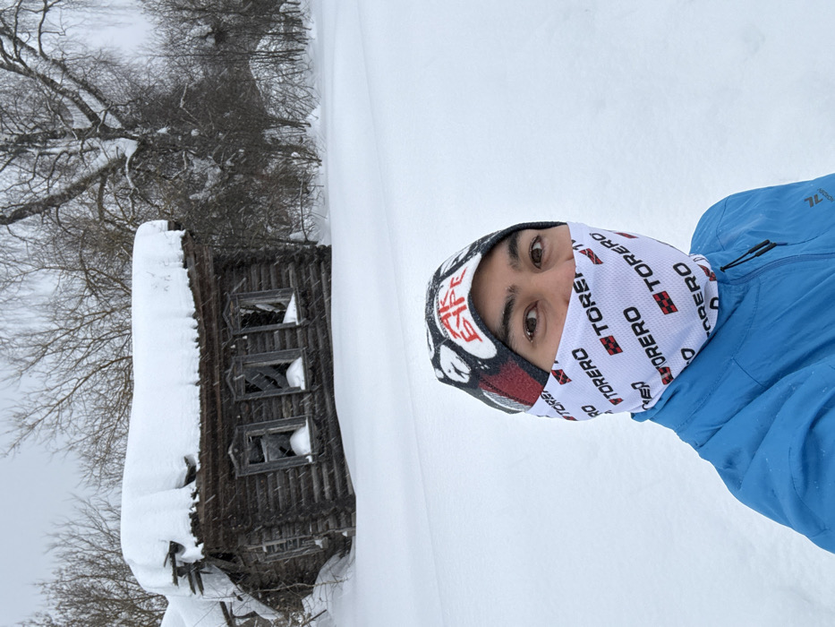 A selfie shows a person with a "Torero" printed neck gaiter and a blue jacket against a snowy backdrop