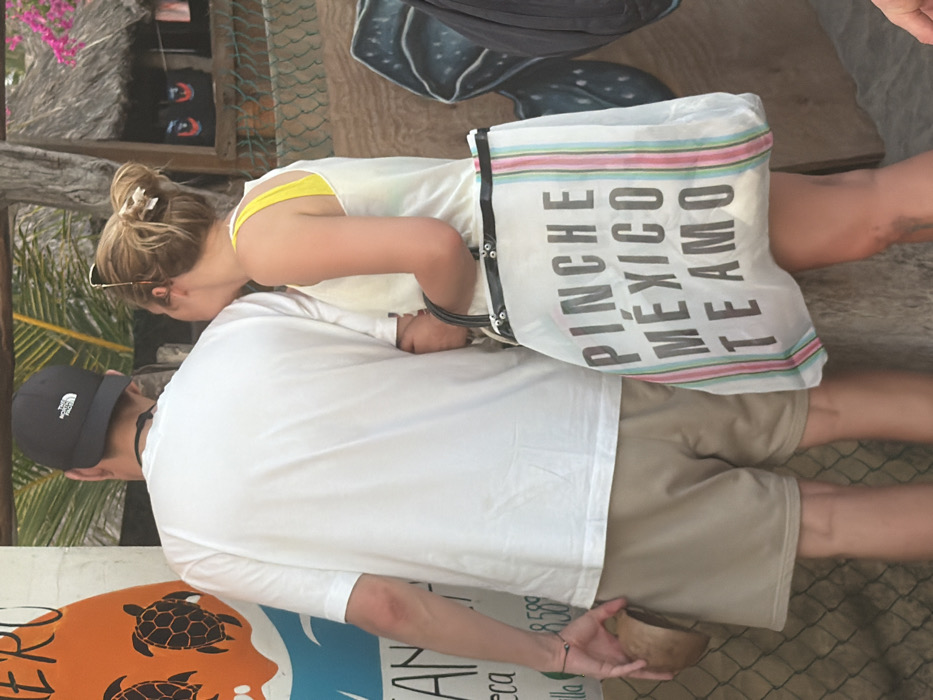 A man and woman are posing, likely for a photo. The man wears a black baseball cap, white shirt, and khaki shorts, holding a brown bowl. The woman has blonde hair and is wearing a white top, yellow bikini strap, and a bag that reads "PINCHE MEXICO TE AMO." They are standing in front of a sign with turtles. The image seems to be rotated and could be taken in a tourist location.