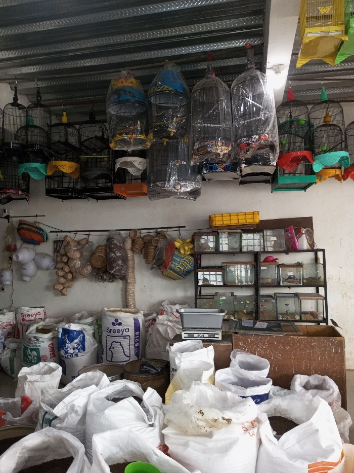 The image depicts the interior of a store in the city of Taohom, Laos. The ceiling is constructed from corrugated metal panels. Numerous bird cages hang from the ceiling and from hooks along the upper wall. Several cages are covered with clear plastic sheeting, while others feature brightly colored plastic bases in teal, yellow, orange, and red. Some cages appear to contain birds. Below the hanging cages, a horizontal metal bar affixed to a white wall supports various items, including woven baskets, feed dispensers, and other indeterminate objects, suggesting pet or agricultural supplies. To the right, a black metal shelving unit holds multiple glass aquariums and tanks. These tanks contain substrate and appear to house small animals such as fish or crabs, along with pet accessories. A yellow plastic crate rests on top of this shelving unit. The lower portion of the scene is dominated by a large quantity of white and off-white sacks, primarily resting on the floor and stacked. Several sacks are labeled "Sreeya" with a chicken logo, indicating they contain animal feed. Many sacks are open, revealing granular contents. A digital scale with a gray weighing pan is positioned on a dark wooden counter or surface to the right, amidst the sacks. Adjacent to the scale, a large, worn wooden box or bin is present. A small, dark-feathered bird is perched on the upper edge of this wooden box on the far right. No human figures are visible in the scene.