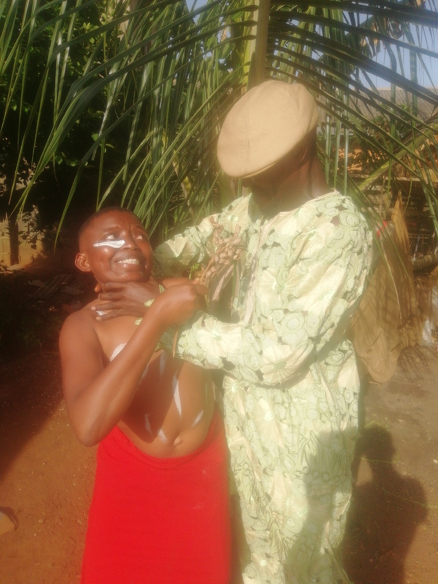 In an outdoor setting in Unknown, Unknown, a man in a light green patterned robe and a tan cap is strangling a second man who is shirtless except for a red cloth wrapped around his waist. The shirtless man has white paint on his face and chest. They are standing in front of a palm tree.