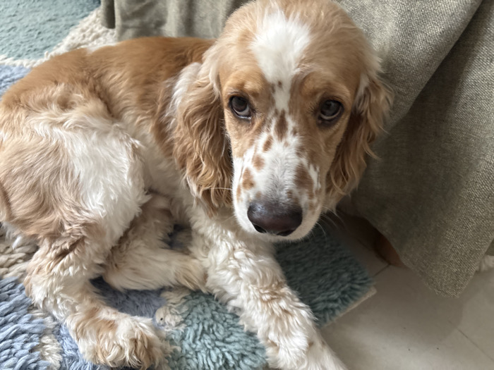 - "A medium-sized Cocker Spaniel lies on a blue, white, and tan rug" by FM-20Tbw1, licensed under CC BY 4.0