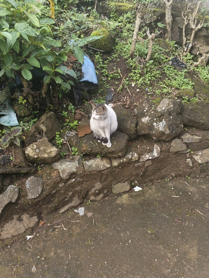- "A domestic cat sits facing left on a moss-covered stone retaining wall next to a concrete or packed earth path in an unspecified city in Vietnam" by FM-VDTjj2, licensed under CC BY 4.0