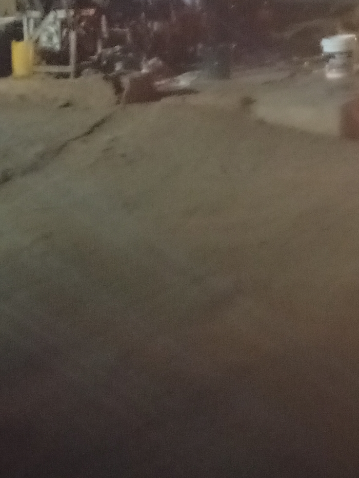 A blurry, low-quality image shows an outdoor scene, possibly at night. Foreground consists of a darkened, undefined surface. In the background, a variety of objects are indistinctly visible, including what looks like a yellow bucket, some sort of structure, and several other unidentifiable items. The overall scene lacks sharpness and clarity.