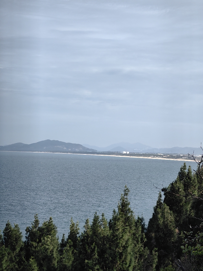 The image displays a coastal panorama from an elevated viewpoint in Tuy Phong 4, Vietnam. The lower third of the frame features dense, dark green evergreen tree canopies. Beyond these, a wide body of dark blue-grey water extends to the horizon, showing slight surface texture. A light sandy beach forms the distant coastline, backed by hazy, blue-grey mountain ranges. On this distant shore, a large white building complex and other structures are visible toward the right. The upper portion of the image shows an overcast sky with horizontal stratiform clouds in shades of light blue and grey. No human subjects, actions, or interactions are present.