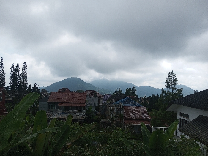 The image displays an elevated view of a residential area within Kondha, India, under a heavily overcast sky. In the foreground, large green leaves, consistent with banana plants or similar broadleaf vegetation, are prominent. The midground contains a cluster of multiple-story residential buildings with diverse architectural styles and roof materials, including red, brown, and blue-grey tiles. Some structures appear older, while a section of a white-walled house with a dark grey roof is visible on the far right. Several tall, slender coniferous trees, indicative of pine species, are interspersed among the buildings, notably on the left and right sides of the frame. The background features a range of verdant mountains and hills, partially obscured by low-hanging, uniform grey cloud cover. No individuals or discernible activities are present.