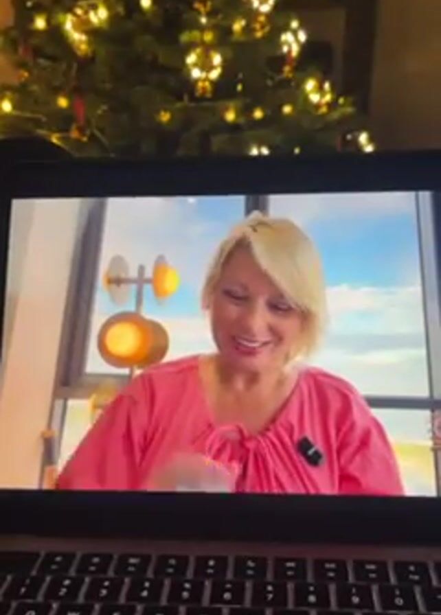 person looking at a laptop screen with a Christmas tree blurred in the background. On the screen is a blonde woman in a pink shirt talking. She is smiling and appears to be on a TV or streaming program. The background behind her shows a window with a coastal view and what looks like modern art. The laptop's keyboard is visible. The person's hands are resting on it.
