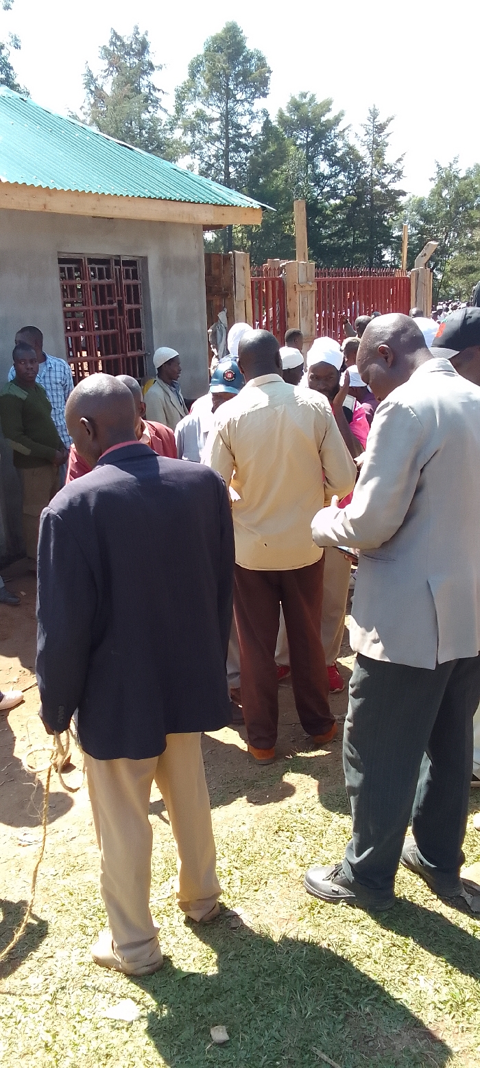 group of people standing in front of a building with a green roof, likely a construction site. The building has wooden framing and a partially constructed wall. The location is Kakunga, Kenya, with coordinates latitude 0.374 and longitude 34.855. There are trees surrounding the building, and the ground is covered in grass. One man is wearing a navy blue jacket and khaki trousers, and another is wearing a beige shirt and brown trousers. Other individuals are visible but obscured by the group. The group is interacting with each other, and some people are wearing hats.