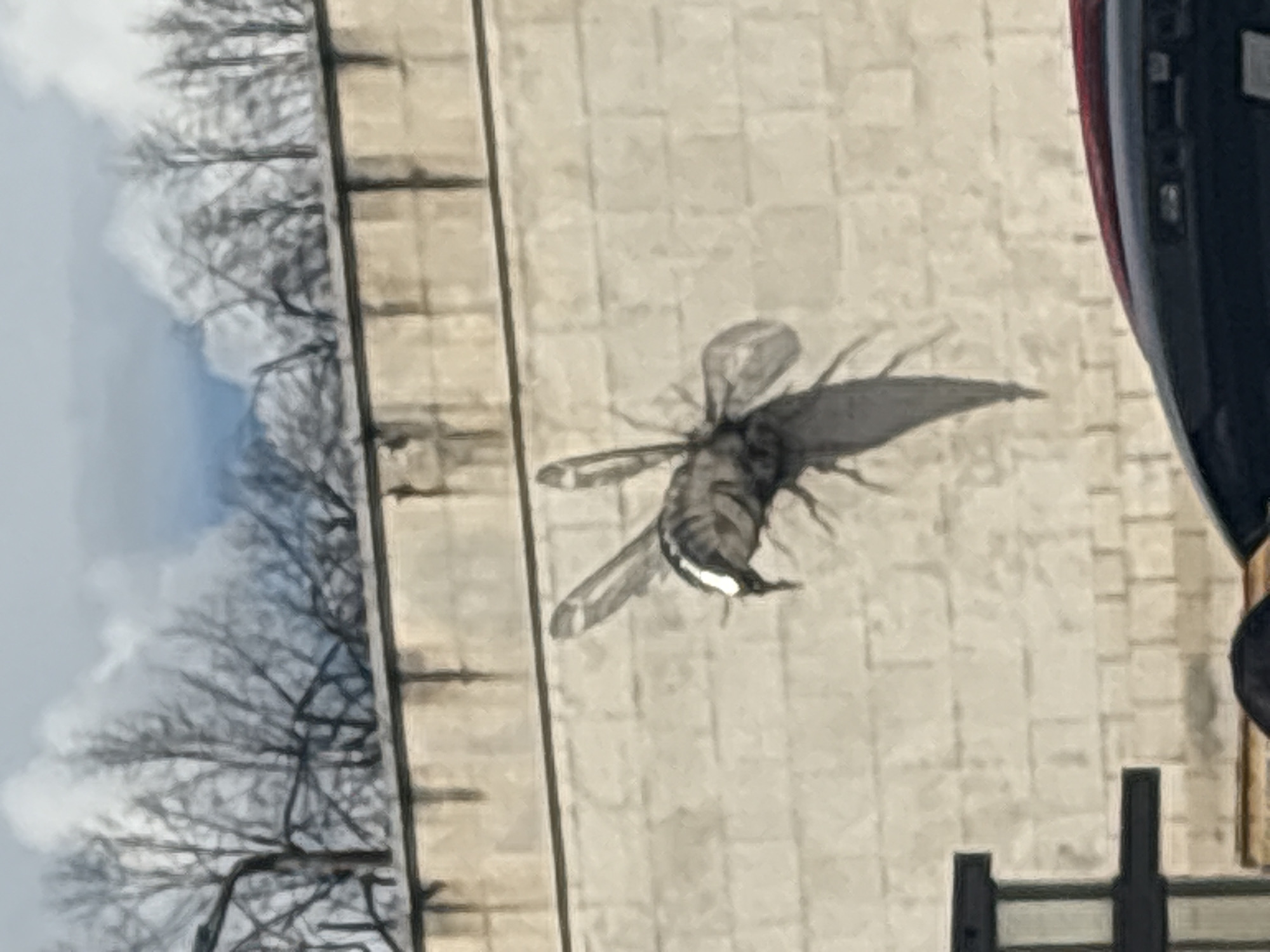 The image presents an urban outdoor scene in Gabrovo, Bulgaria. A large, dark, metallic sculpture, resembling an oversized fly or insect, is prominently affixed to a light-colored brick or stone wall in the mid-ground. The sculpture features two pairs of wings, segmented legs, and a distinct white marking on its anterior section. The wall, composed of light-toned rectangular units, traverses the image horizontally. Above the wall, a dense array of bare tree branches is silhouetted against an overcast sky featuring patches of brighter clouds. The lower foreground includes partial views of urban elements: the dark roofline and red trim of a vehicle are visible on the bottom right, while a dark vertical structural element and the top of a human head are discernible on the bottom left.