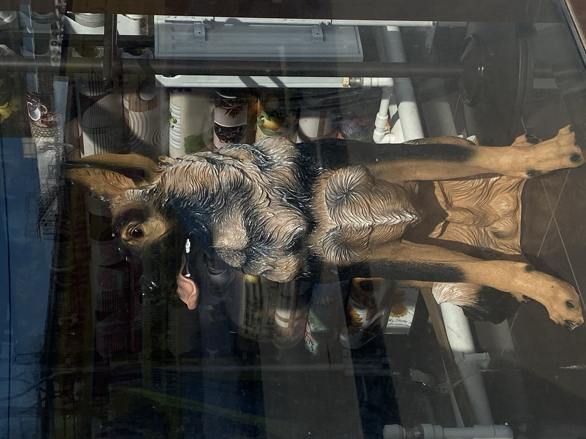 - "A tan and brown dog statue is lying flat on a glass surface, seemingly viewed from above" by FM-uGjpn1, licensed under CC BY 4.0