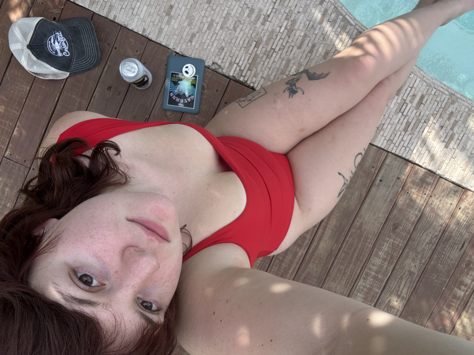 A woman in a red swimsuit poses near a pool. She is lying on a wooden deck next to white tiled coping. A baseball cap, a can, and a phone rest nearby. The woman has fair skin and reddish-brown hair. She has tattoos on her legs. The pool water is visible. The photo is taken from a high angle, showing the woman's face and body.