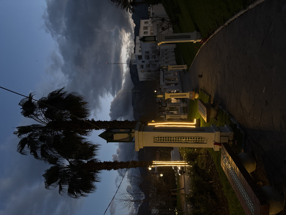 A palm tree is silhouetted against a dramatic sky with dark, swirling clouds. A winding pathway leads towards a cluster of white buildings nestled at the base of a mountain range. Illuminated ornamental structures line the path, casting a warm glow on the surrounding greenery. The scene evokes a sense of tranquility and grandeur.