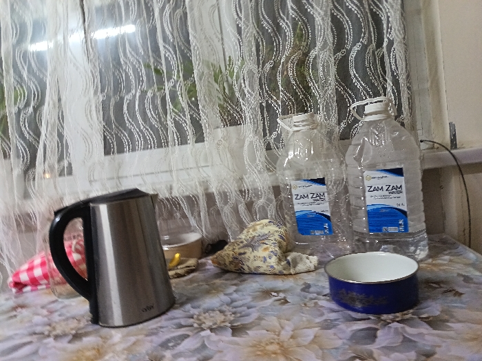 A kitchen scene showcases a stainless steel electric kettle, a small tan bowl with a yellow object inside, and two large plastic bottles of "Zam Zam Water." A folded cloth rests near the kettle, and a blue and white bowl sits in the foreground. A floral-patterned tablecloth covers the surface. The background features a window covered by lace curtains.