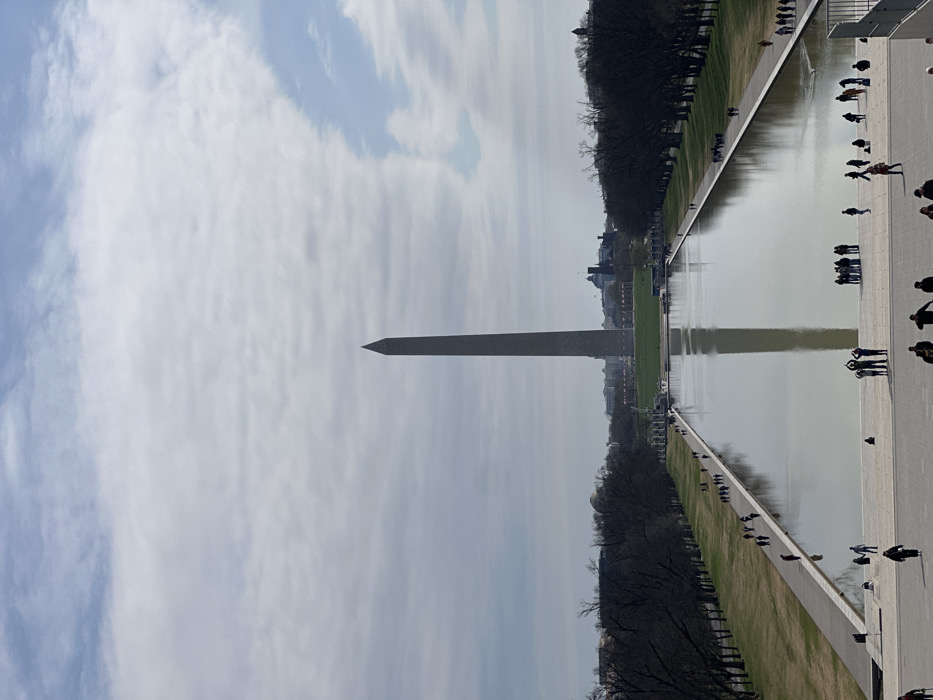 The image presents an eastward panoramic view of the National Mall in Washington, D.C., United States of America. The Washington Monument, a tall, slender grey obelisk, stands centrally in the mid-ground against an overcast sky featuring a mix of grey and white clouds, with a segment of blue visible in the upper right quadrant. The monument's reflection is clearly visible in the calm, elongated rectangular surface of the Reflecting Pool, which extends from the mid-ground into the foreground. The Reflecting Pool is flanked on both sides by wide, green grassy areas bordered by rows of deciduous trees with bare branches, indicative of late winter or early spring. Paved walkways run parallel to the Reflecting Pool on both sides. Numerous individuals are distributed throughout the scene. Small groups and single figures are observed walking along the paved pathways adjacent to the Reflecting Pool. Larger clusters of people are congregated on the broad paved area in the immediate foreground, consistent with the steps of the Lincoln Memorial. In the lower left foreground, a group of three individuals is visible, with one person holding their arms outstretched above their head. Other distant structures are discernible on the horizon behind the Washington Monument. The scene is illuminated by natural daylight.