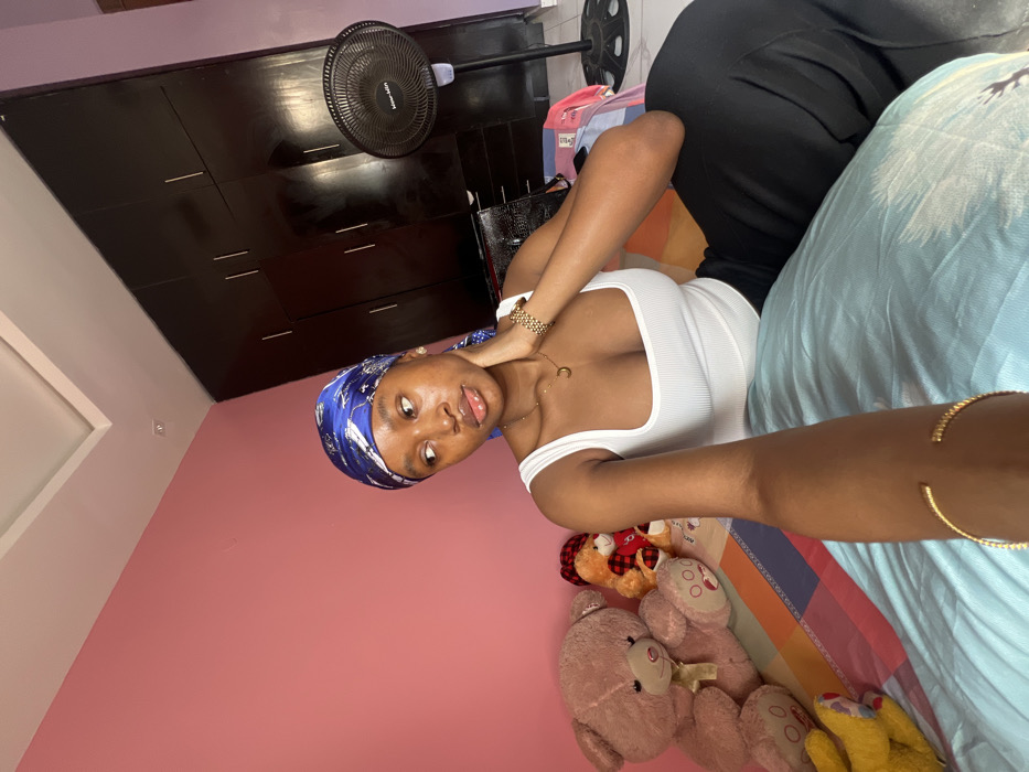 The image depicts an indoor scene within a residential room in Odo Ogun, Nigeria. A single individual, appearing to be an adult female with dark skin, is seated on a bed. She is wearing a blue satin headwrap with a white pattern, a white ribbed square-neck tank top, and black trousers. Her left hand is positioned near her neck and jawline, while her right arm is extended towards the camera, indicating she is capturing the image. A gold-colored cuff bracelet is visible on her right upper arm. She also wears a gold-colored necklace with a crescent moon pendant and a gold-colored link-bracelet watch on her left wrist. Her gaze is directed off-camera to the right. The wall behind the subject is painted a solid pink. To the right, a dark brown four-door wardrobe is visible, adjacent to which a black standing fan rests on a white tiled floor. A portion of a white ceiling with a recessed panel design is visible above. On the bed, to the left of the subject, are two teddy bears: a larger light brown bear with a light brown bow tie, and a smaller light brown bear dressed in a red and black plaid shirt. The bed is covered with a multi-colored patterned duvet featuring geometric shapes in yellow, blue, red, and white, partially covered by a light blue pillow or blanket. A dark, unidentified object, possibly a bag, is on the floor beside the wardrobe. The room is brightly lit.