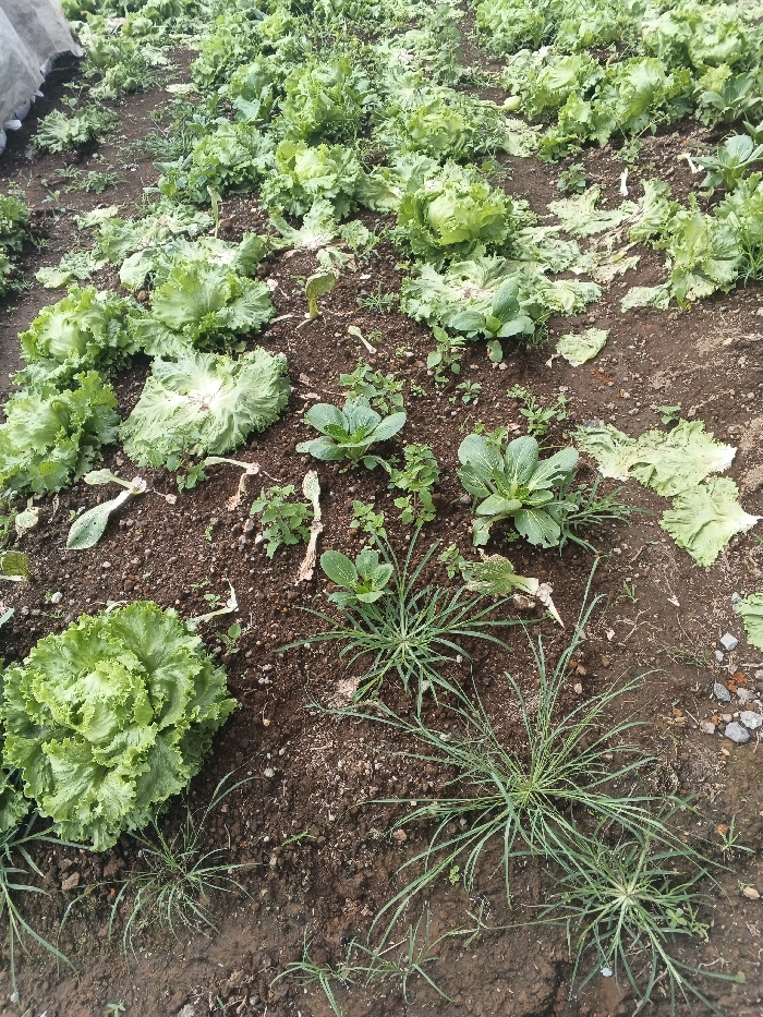 The scene depicts an agricultural plot or garden situated within Pô Kô, Vietnam. The ground consists of dark brown, exposed soil, showing areas of cultivation and scattered plant debris. Numerous heads of light green, frilly-leafed lettuce are present, appearing mature or partially harvested, with detached leaves and severed stalks visible on the soil. Interspersed among the lettuce are smaller clusters of darker green, smooth-leafed plants, consistent with young Asian greens such as bok choy. Various narrow-bladed grasses and weeds are also growing across the plot. No human figures or specialized tools are visible. An indistinct light-colored object is partially present at the upper-left edge of the frame.