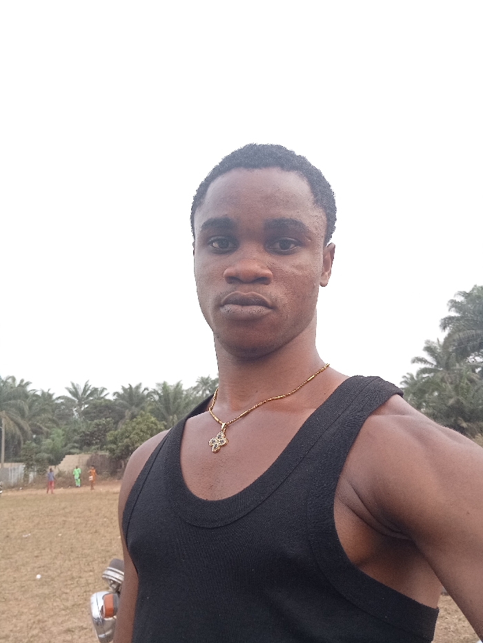 A young man is centered in the image, wearing a black tank top and a gold necklace with a cross pendant. He has short, dark hair and a serious expression. The background shows a grassy field with palm trees and some indistinct figures in the distance. The sky is overcast, suggesting a cloudy day. A portion of what appears to be a vehicle is visible in the lower left corner of the frame.