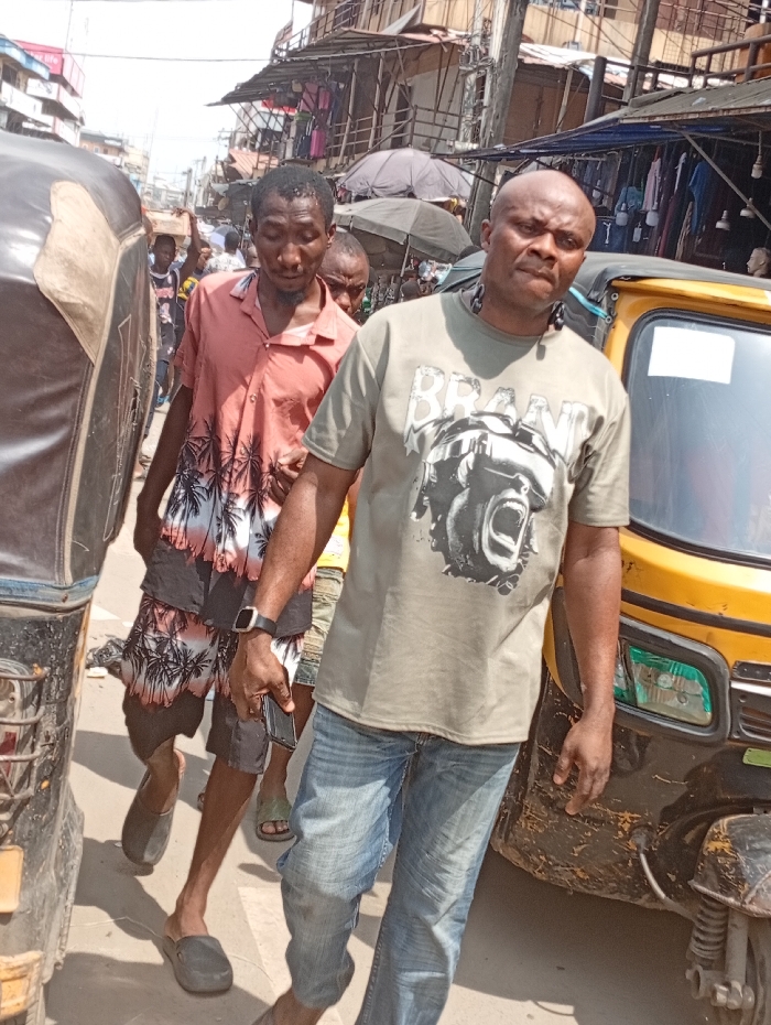 Three men walk on a street lined with vendors and auto rickshaws. The first man wears a red shirt with a palm tree pattern and black shorts. The second man is between the first and third men. The third man, in front, wears an olive green t-shirt with a graphic print and blue jeans. Both the first and third men wear dark-colored footwear. The background shows a bustling street scene with open-air shops and people.