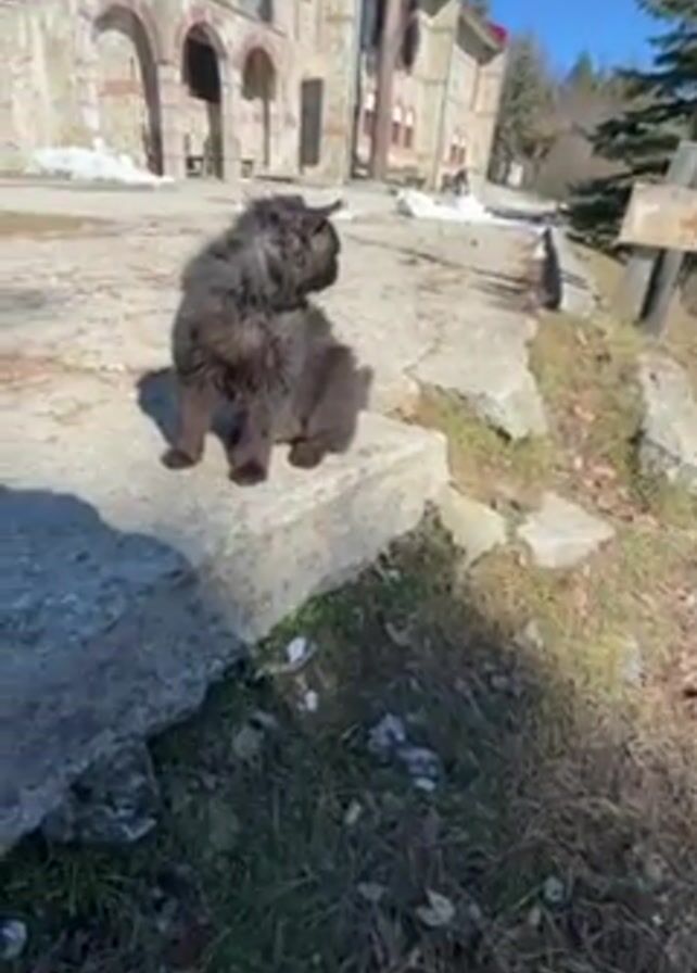 fluffy, long-haired, black cat sitting on a gray concrete step in front of a building that appears to be a church. The cat is facing to the left of the frame and looking towards the church. The church is a two-story stone structure with a red roof. There are people visible on the second story of the church near a white railing. The sky is blue, and the sun is shining. There is some snow on the ground near the church. There are trees and shrubs visible around the church. The ground near the cat is covered in grass and dry leaves. The camera is at a low angle, looking up at the cat and the church.