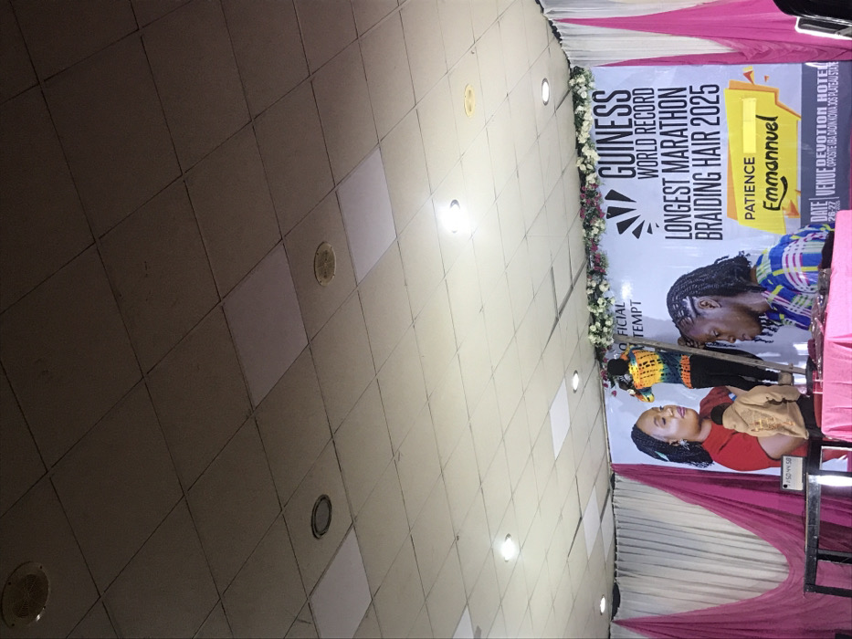 A banner advertises a Guinness World Record attempt for the longest marathon of braiding hair in 2025. It features the names Patience and Emmanuel. The banner has a floral border and an image of a person braiding another person's hair. The venue is Devotion Hotel. The image may be from a low angle, showing a tiled floor and ceiling lights. Pink and white draping is seen at the edges of the banner. The image has the number 5044.58 on it.