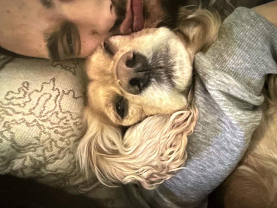 The image depicts a close-up indoor scene in Cherven Bryag, Bulgaria, featuring a human male and a medium-sized dog in intimate proximity. A light-colored dog, possibly a Cocker Spaniel, with tan fur and long, wavy ears, occupies the central foreground. The dog's eyes are partially closed, and its snout is directed towards the viewer. To the right, the partial face of a human male is visible, showing his right eye, eyebrow, a portion of his nose, and pursed lips. He has dark hair and facial hair. His left arm, clad in a grey long-sleeved, ribbed garment, is partially visible, appearing to embrace the dog. The dog's head rests against the human's shoulder/chest area. Behind the subjects, a patterned pillow or cushion with an off-white or light beige color and a faint, swirling decorative pattern is present. The overall lighting is soft, suggesting an interior setting.