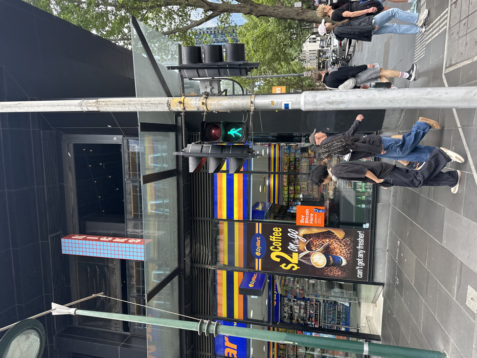 A storefront, identified as "EzyMart," advertises "$2 Coffee on the go." Adjacent signage promotes Bitcoin purchases. A crosswalk signal displays a green "walk" symbol. Pedestrians are visible crossing the street. The building's facade features glass panels and dark structural elements. A sign with an unknown message is partially visible above the storefront. Trees are visible in the background.
