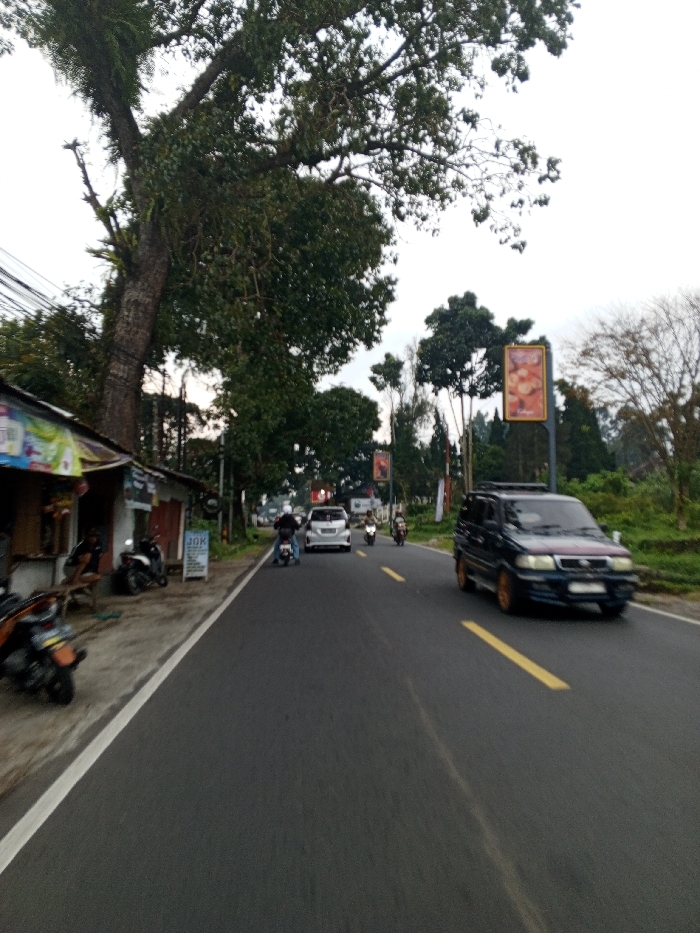 The scene depicts a two-lane asphalt road in Kheda, India, viewed from a low perspective, potentially from a moving vehicle. The road features a solid white line on its left shoulder and broken yellow lines delineating the lanes. On the left side of the road, a large, mature tree with a thick, textured trunk and a dense green canopy dominates the foreground, with epiphytic plants growing on its branches. Utility wires run horizontally behind the tree. Adjacent to the road, a series of small, rustic roadside structures with corrugated metal roofs and open storefronts are visible. One structure has a person sitting on a wooden bench inside. Multiple motorcycles are parked on the dirt shoulder next to these structures, including a partially visible orange and black scooter in the immediate foreground. A white sign with "JOK" is affixed near one of the shops. On the road, traffic is present in both directions. In the mid-ground, a dark blue/black SUV (resembling a Toyota Kijang) with a roof rack and light-colored rims travels from right to left, exhibiting slight motion blur. Behind it, a motorcyclist in a white helmet is visible. Further down the road, a white sedan travels from left to right, followed by another motorcycle. More distant vehicles are visible, including other motorcycles. The right side of the road features a gently sloping, verdant landscape with various trees and dense green foliage. Several tall billboards displaying advertisements are visible further along the road, one with a prominent red/orange background. The sky above is overcast and light gray.
