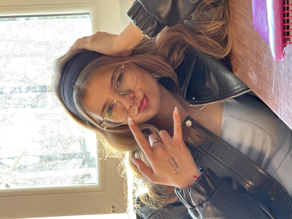 A young female, appearing to be in her late teens or early twenties, is depicted seated indoors, positioned centrally in the frame. She has long, wavy brown hair, a black headband, and gold-framed glasses. Her lips are painted with red lipstick, and she is looking directly at the camera with a slight pout. She wears a black leather-style jacket over a light grey ribbed top. Her left hand, adorned with a silver-colored ring on the ring finger and a red string bracelet on the wrist, is raised in a "rock on" gesture, with the thumb, index, and pinky fingers extended. A faint blue inscription, appearing to be Cyrillic text "МАНИКА с тони къръ", is visible on the back of her left hand between the thumb and forefinger. Her right hand rests on her head, touching her hair and headband. She is seated at a wooden table or desk, the edge of which is visible in the lower right foreground. A pink object, possibly a hairbrush or a small notepad, is partially visible on the table. Behind her is a large window with a white frame, through which bright sunlight streams, illuminating blurred outdoor foliage. The specific location within Pernik, Bulgaria, is not discernible from the visual information provided in the image.