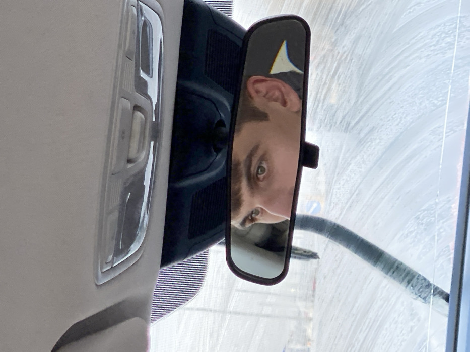 The image depicts the interior of a vehicle, viewed from the driver's or front passenger's perspective, at an auto car wash in Unknown, Russia. A male individual's face, specifically his eyes, nose, forehead, and a portion of his right ear, is prominently reflected in the rearview mirror. He has short, dark hair and light-colored eyes. The vehicle's windshield is entirely obscured by a thick, white layer of soap or foam, indicating the car is actively being washed. Streaks on the foam suggest water movement or wiper action, with a vertical dark element, possibly a wiper blade, visible on the lower left of the windshield. Above the rearview mirror, the vehicle's light-colored headliner and an overhead console with interior lights and buttons are visible. Through the foamy windshield, a faint blue circular sign with a white horizontal stripe is discernible in the background.
