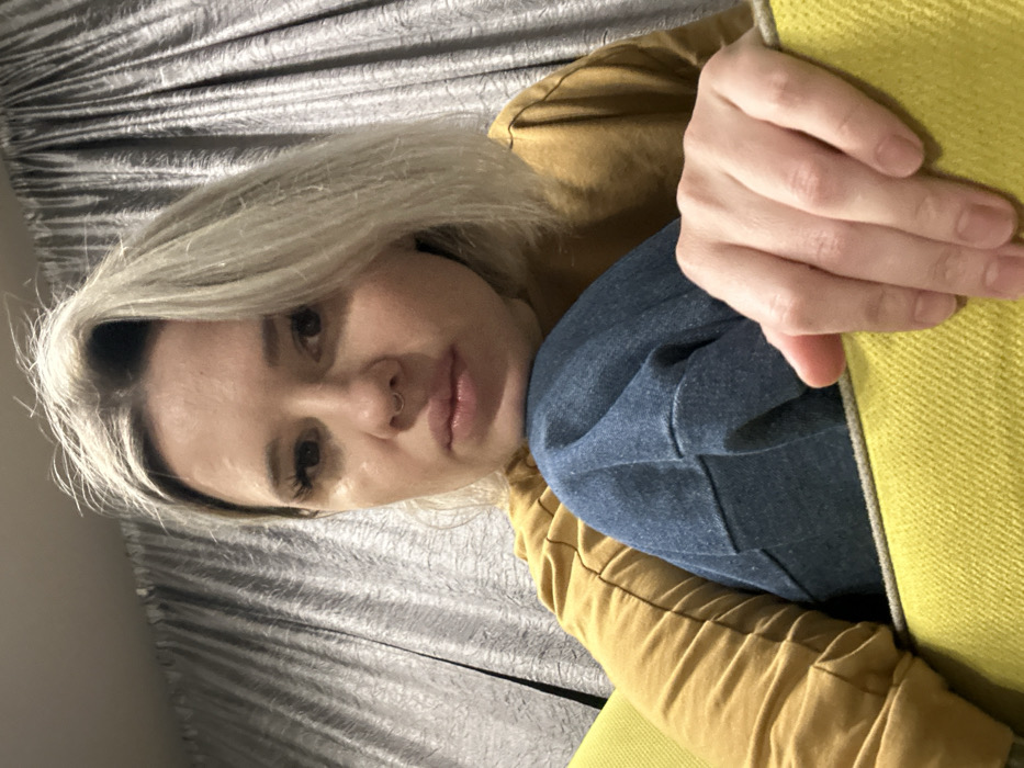 The image displays an adult female in an indoor setting, identified as a residence in Rostov-on-Don, Russia. The subject possesses shoulder-length, wavy blonde hair and a septum piercing. She is dressed in a long-sleeved mustard-yellow top, exhibiting horizontal folds, and blue denim-style pants. The subject is positioned in a seated or lounging posture, with her left knee drawn upwards towards her chest. Her right hand rests on the brightly illuminated, coarse-weave, lime-green upholstered surface of what appears to be a sofa or chair in the foreground. She is looking directly at the camera with a neutral expression; a faint light-colored mark is visible below her left eye. The background consists of closed, floor-length, dark grey or silver pleated curtains. The scene is illuminated by artificial interior lighting, consistent with a residential environment.