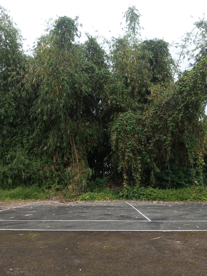 A dense thicket of bamboo dominates the view, its tall stalks covered in green foliage and climbing vines. A clearing within the bamboo reveals hints of deeper vegetation. In the foreground, a worn asphalt surface with white lines, resembling a tennis court, contrasts with the natural overgrowth. Green grass and weeds grow along the edge of the bamboo, blurring the boundary between the court and the thicket.