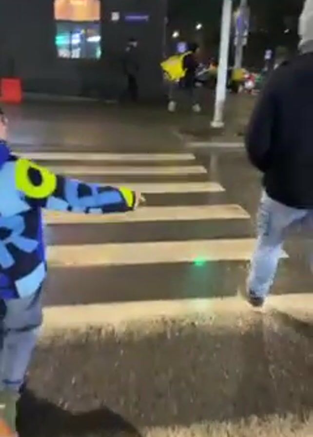 A young child in a blue and yellow patterned jacket and light-colored jeans runs across a crosswalk at night