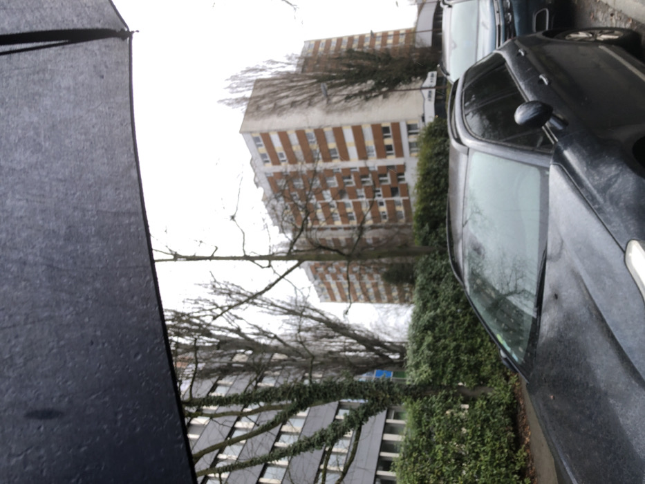 This image depicts an urban street scene in Schiltigheim, France, under overcast weather conditions. The top quarter of the frame is occupied by a dark, wet umbrella, displaying numerous water droplets. Below the umbrella, the hood and windshield of a dark-colored SUV or crossover are visible, also appearing wet, indicating rain or recent precipitation. A lighter-colored vehicle is partially visible parked behind it to the right. A dense, green hedge runs horizontally across the midground. Behind the hedge, several deciduous trees with bare branches are present, one on the left heavily covered in ivy. To the left, a modern building with a dark grey facade and multiple windows is partially seen. Dominating the right side of the midground is a tall, multi-story residential building featuring a facade with alternating white and orange-brown paneling, equipped with numerous windows and balconies. The sky above is uniformly overcast. No people, specific actions, or interactions are visible.