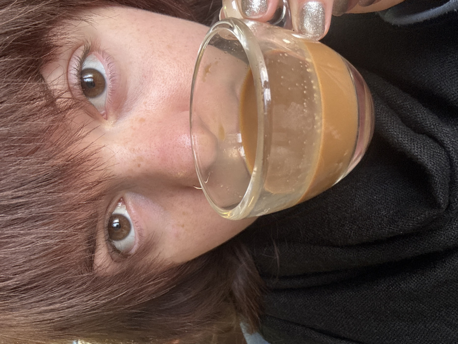 A person with light skin, brown hair, and brown eyes holds a clear glass mug containing a light brown liquid. The mug is positioned near their face, partially obscuring the view. The person wears silver nail polish. A black garment is visible on the side. The image is rotated, displaying the subject at an angle. The person has a nose ring.