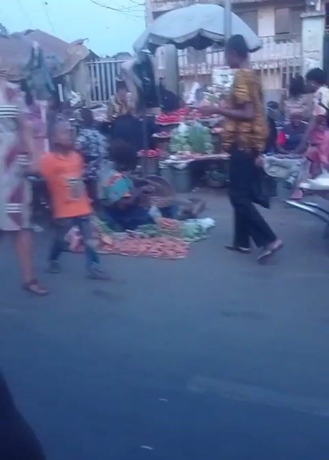 bustling outdoor market scene. Several people are milling around, some appearing to be vendors displaying various goods, including vegetables, produce, and other wares. A person is pushing a wheelbarrow filled with items. There are tables and baskets filled with goods on display. In the background, buildings are visible, and the sky is overcast. A yellow auto rickshaw passes by. The overall atmosphere is that of a busy marketplace.
