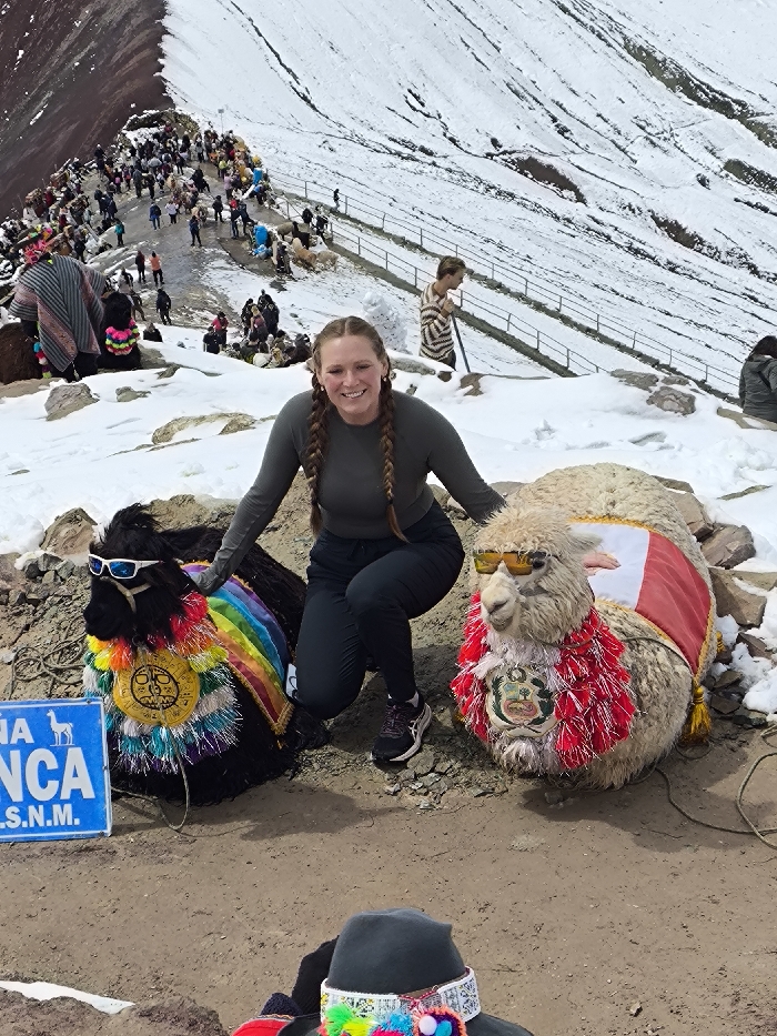 A woman with braided hair crouches between two llamas on a mountain. The black llama wears sunglasses and a rainbow-colored sash with a gold medallion. The white llama also wears sunglasses and a Peruvian flag. In the background, a crowd of people is visible on a snowy slope beneath a red and white mountain. A sign with blue lettering stands near the black llama. A person wearing a hat is partially visible at the bottom.