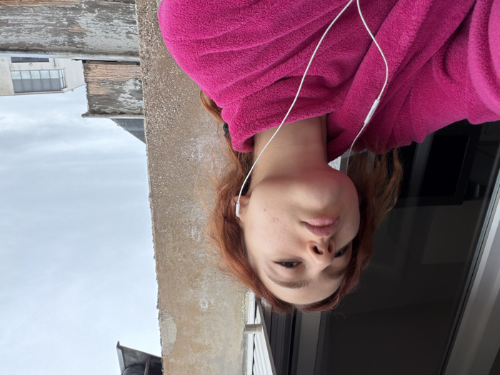 A young female is captured from a low angle, positioned on what appears to be a balcony or terrace in Reims, France. She has reddish-brown hair and is clad in a bright pink, fuzzy robe or jacket. White wired earbuds are inserted into her ears, with the cords visibly extending across her chest. Her head is tilted slightly back, lips are pursed, and she maintains direct eye contact with the camera. To the left, a dark, reflective surface, likely a window or glass door, is visible. To the right, a weathered concrete or stone pillar rises vertically. Beyond the pillar, a dark, possibly tiled roof structure with visible peeling paint on its wooden trim is present, followed by a distant modern building characterized by large windows and light-colored facades. The sky is overcast.