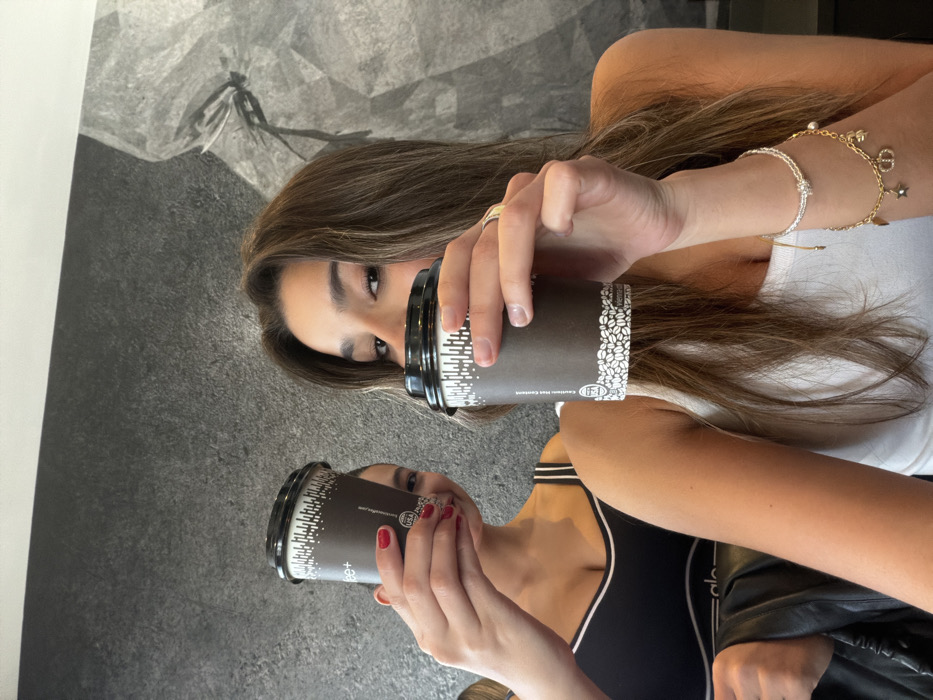 Two young adult females are depicted indoors, within a Vienna Coffee Company establishment in Miami, Florida, United States. The foreground subject, a female with long, light-brown hair, partially obscures her face with a brown disposable coffee cup held in her right hand, revealing her right eye and nose. She wears a white tank top and multiple gold bracelets, one featuring a "CD" logo charm and a star, and a silver-toned ring on her right ring finger. The background subject, a female with dark hair, smiles towards the camera while holding an identical coffee cup in her left hand, which displays red nail polish. She wears a black sports bra with an "alo" logo visible and has a black garment draped over her left arm. Both coffee cups feature "coffee +", "Caution Hot Content", "Vienna Coffee", and a coffee bean graphic. The background is a dark gray, textured wall with a large, abstract light gray and black design on the right side.