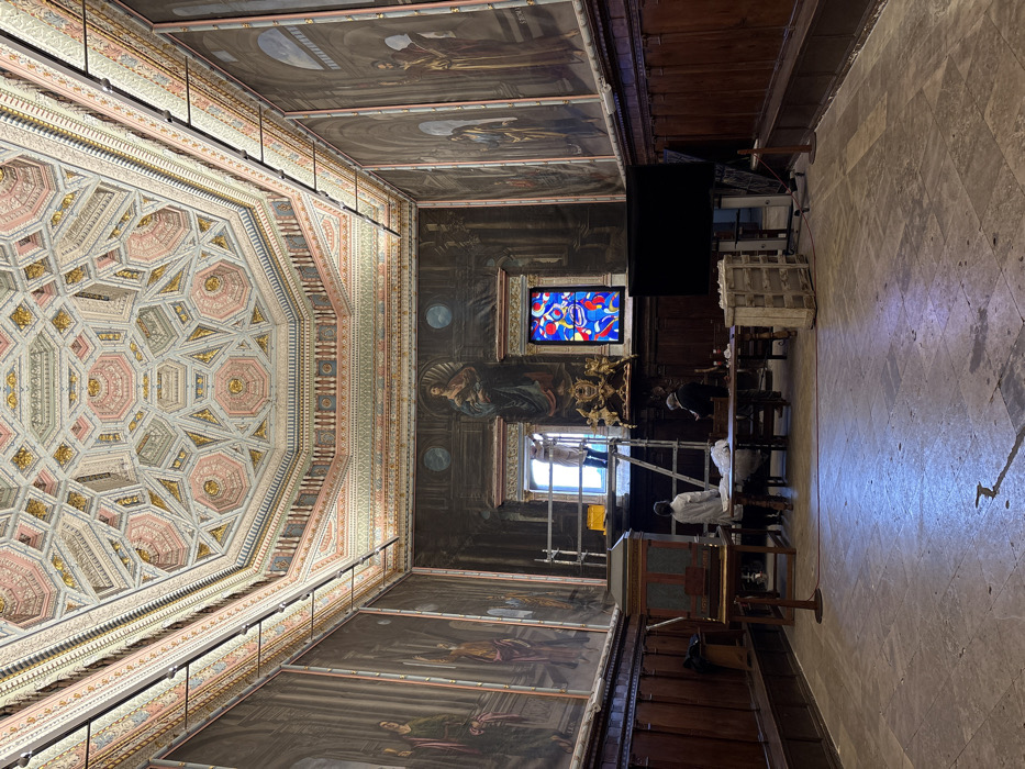 The image depicts the interior of the Sala de los Apóstoles (Hall of the Apostles) within the Palacio Episcopal (Episcopal Palace) in Cuenca, Spain. The rectangular hall features a highly ornate, multi-faceted Mudejar-style coffered ceiling with intricate geometric patterns in muted pink, gold, and light blue-grey tones. The upper sections of the walls are covered with large, dark-toned oil paintings depicting religious figures and architectural scenes. The lower wall sections are clad in dark wood paneling. The floor is composed of large, light-colored stone flagstones, showing some wear and reflections. In the mid-ground, three individuals are present. One person, wearing a white lab coat, stands on a silver-colored metal scaffolding, facing and attending to a window aperture. A yellow bucket rests on the scaffolding platform. Below, to the left, another person in a white lab coat stands behind a large, dark wooden table covered with white cloths or papers, facing away from the camera. A third person, wearing a dark jacket and a cap, is partially visible standing near the right side of the table, looking towards the scaffolding. Above the scaffolding and window, a prominent large oil painting of the Virgin Mary holding a child is affixed to the wall. To the right of this, another rectangular opening features a modern, brightly colored abstract stained-glass panel in blue, red, and white. Further to the right, a large black rectangular screen, likely a monitor or television, stands on a rolling base. A wooden crate is situated nearby. Track lighting is installed along the perimeter of the ceiling just above the wall paintings. A smaller, lighter wooden cabinet or lectern stands to the left of the central table.