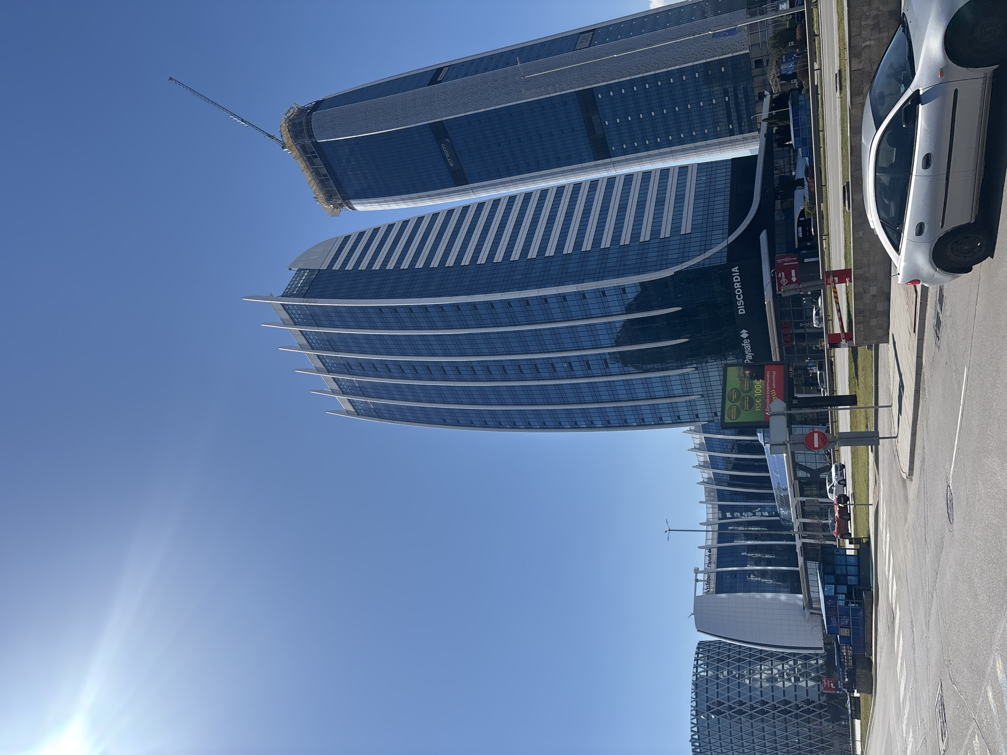 view of the Capital Fort buildings in Sofia, Bulgaria. A clear blue sky provides the backdrop for the modern glass-fronted skyscrapers. One of the buildings is under construction with a crane visible. A road runs along the side of the buildings, with a car parked on the roadside. Signage with "DISCORDIA" and "Paysafe" is visible on one of the buildings. The perspective is from ground level, looking upwards towards the buildings.