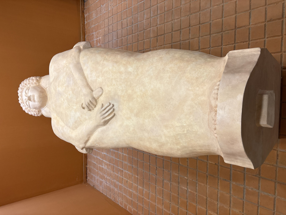 The image displays a large, light-colored anthropoid sarcophagus standing upright, viewed from a low angle, within an indoor environment. The sarcophagus, likely carved from stone or a similar material, depicts a stylized recumbent human figure. The figure has sculpted curly hair, closed eyes, a prominent nose, and a serene facial expression. Its arms are bent, with the left hand resting over the right hand across the lower torso. Bare feet with delineated toes are visible at the base of the figure, resting on a sculpted plinth. The sarcophagus stands on a wider, rectangular base with a smaller protruding block underneath. The floor is tiled with small, square, reddish-brown terracotta tiles, while the surrounding walls are painted a uniform, warm orange-brown color. This object is identified as an anthropoid sarcophagus, characteristic of Phoenician/Punic art, located in the Museo de Cádiz (Museum of Cádiz) in Cádiz, Spain.