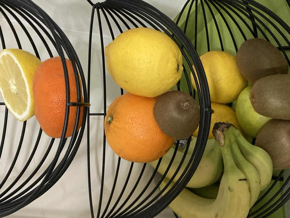 - "A multi-tiered black wire fruit basket, seen in a close-up vertical shot, is filled with various fruits against a plain, light-colored background" by FM-YzcdC3, licensed under CC BY 4.0