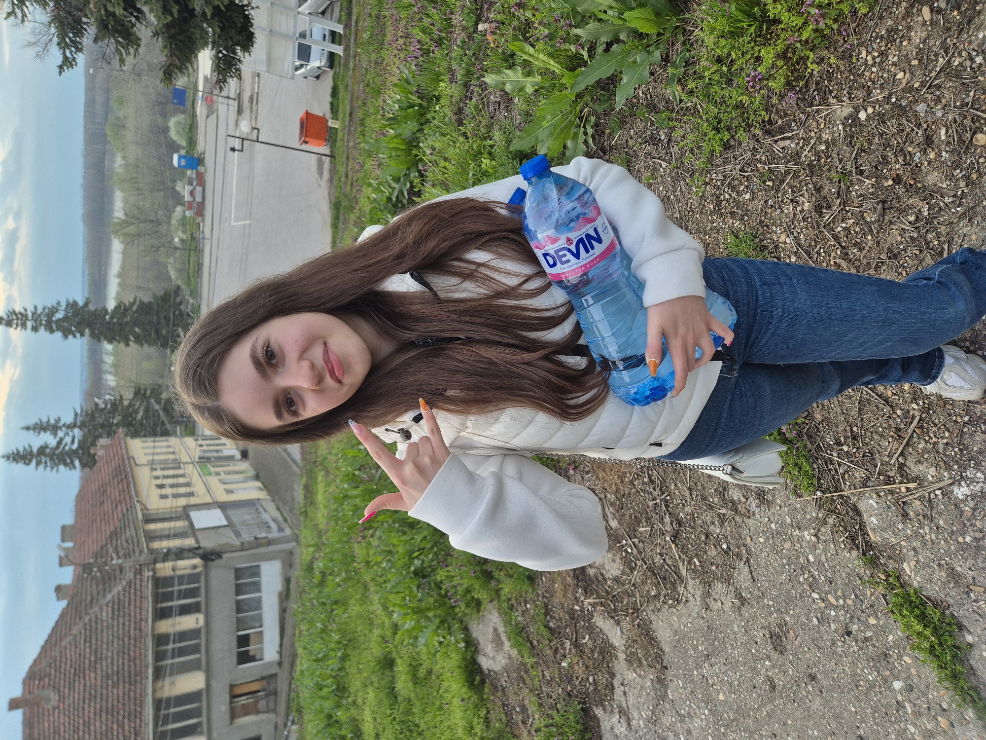 A young woman stands outdoors in Tutrakan, Bulgaria, holding two bottles of "Devin" brand water. She wears a white jacket, blue jeans, and white sneakers. Her fingernails are painted with a variety of colors and designs. She is making a "rock on" gesture with her hand. Behind her is a landscape featuring a river, trees, and a building with a red-tiled roof and yellow facade. Further in the background, there's a paved area with temporary portable facilities. The ground underfoot is a mixture of concrete, gravel, and patches of grass.