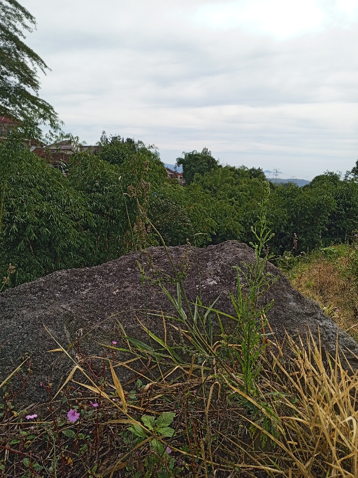 This image depicts an elevated outdoor scene in Silvino Lobos, Philippines, under an overcast sky. The foreground is dominated by a large, irregular, dark gray rock, approximately centered, with a rough, weathered surface. Surrounding the rock and extending to the bottom edge of the frame is a mix of vegetation, including various green grasses, some with seed heads, and patches of dried, yellowish-brown grass. Several small, broadleaf green plants are present, along with a few small, five-petaled purple flowers clustered near the bottom left corner. In the midground, beyond the rock and foreground flora, a dense expanse of rich green foliage from numerous trees and possibly bamboo dominates the landscape, creating a thick canopy. Above and partially obscured by this foliage, particularly on the left side of the frame, are the roofs and upper sections of several buildings or houses, indicating human habitation within the vegetated area. These structures appear to have dark or reddish-brown tiled roofs. The far background reveals faint outlines of distant landforms or hills, partially obscured by atmospheric haze. The sky is entirely overcast, characterized by uniform gray and white clouds stretching across the upper half of the image. No people or animals are visible, and no specific actions or interactions are depicted.