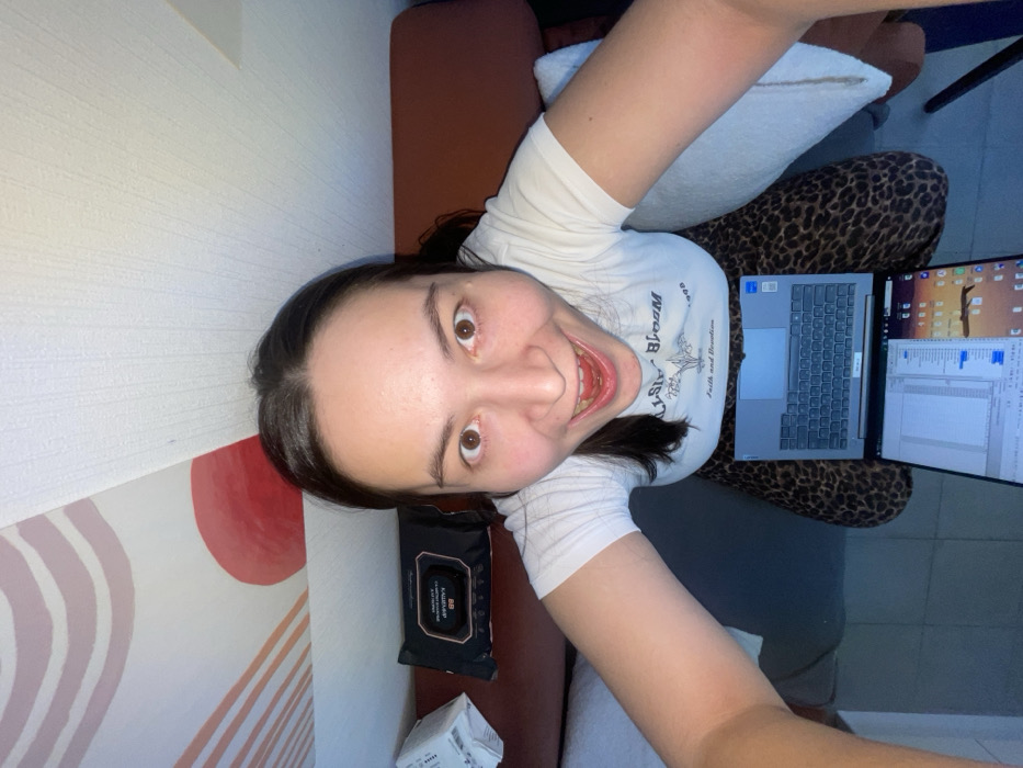 An overhead, wide-angle photograph taken in Zheleznodorozhny, Russia, depicts a female individual with dark hair and light skin, positioned on a light-colored floor, likely kneeling. She is wearing a white t-shirt with a graphic design and leopard-print pants. Her head is tilted slightly forward, and she looks directly into the camera with wide-open brown eyes and an open mouth revealing teeth, conveying an excited or surprised expression. Her arms are extended downwards, out of frame, suggesting she is holding the camera for a selfie. Between her knees rests an open laptop, possibly a Lenovo, displaying a keyboard and trackpad on the upper screen, and an extended lower screen showing what appears to be a spreadsheet application alongside a desktop background. Behind her, to the left, a reddish-brown upholstered couch or sofa is visible. On the couch, a black package labeled "INGLOT CLEANSING LOTION" and a white box are placed. The upper background features a white wall or ceiling adorned with abstract, curved lines in shades of pink, orange, and red.
