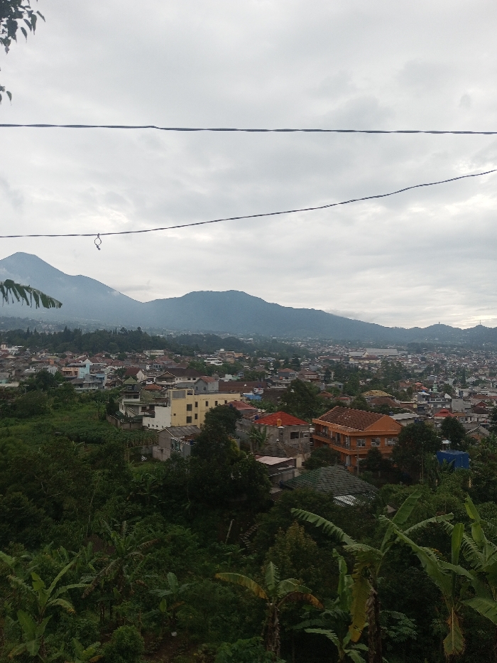 An elevated, wide-angle photograph depicts a densely populated urban area identified as Bhupalpally, India, situated against a backdrop of multiple mountain ranges. The sky is overcast with uniform grey clouds. In the far background, dark, hazy mountains rise under the cloud cover. The midground features a sprawling residential city, characterized by numerous multi-story buildings and houses with varying roof colors, including prominent yellow and orange structures. The immediate foreground is dominated by lush, dark green tropical vegetation, including large-leafed plants resembling banana trees. Two dark, horizontal utility lines traverse the upper-mid section of the frame; the lower line features a small, circular attachment. Tree leaves are partially visible in the top-left corner. No individuals, specific actions, or interactions are discernible within the frame.