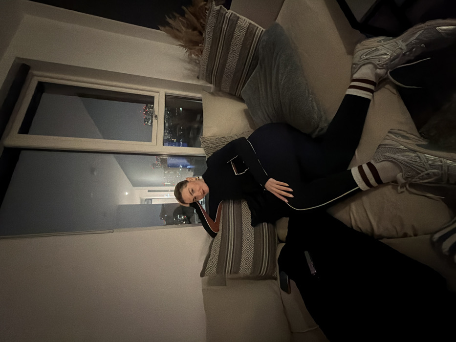 A woman lies on a light-colored couch indoors. She wears dark clothing with white trim, athletic socks, and silver sneakers. Pillows in shades of gray and brown are behind her. Outside the nearby window is a nighttime cityscape. The room is dimly lit, and the image is oriented sideways. A dark object rests near the base of the couch.