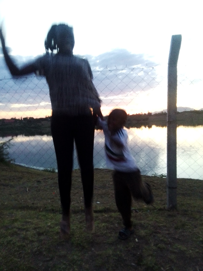 A blurry, full shot shows two figures near a fence against a lake and setting sun. The taller, silhouetted figure appears to be jumping, arm raised, while holding the hand of a smaller child who is in motion. The child wears a light shirt and dark pants. The background features calm water reflecting the sky, a thin treeline, and distant hills. The image has a grainy quality.