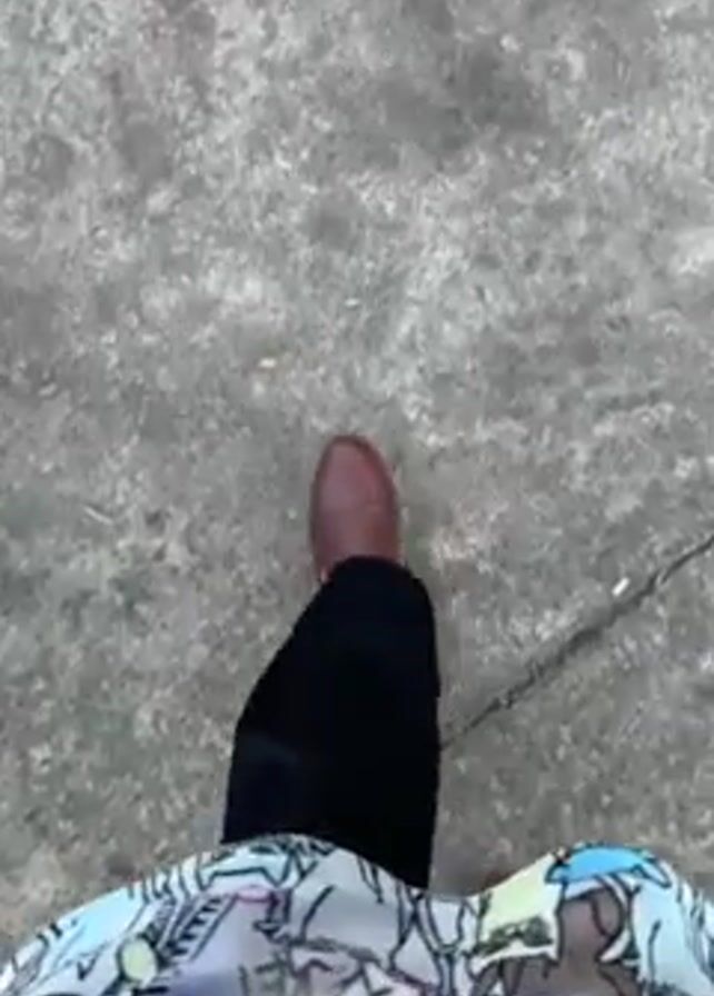 A person walks on a concrete sidewalk. The video is shot from the perspective of the person walking, showing their feet and lower body. The person is wearing brown shoes, black pants, and a colorful floral-patterned top. There are a few fallen leaves on the sidewalk.