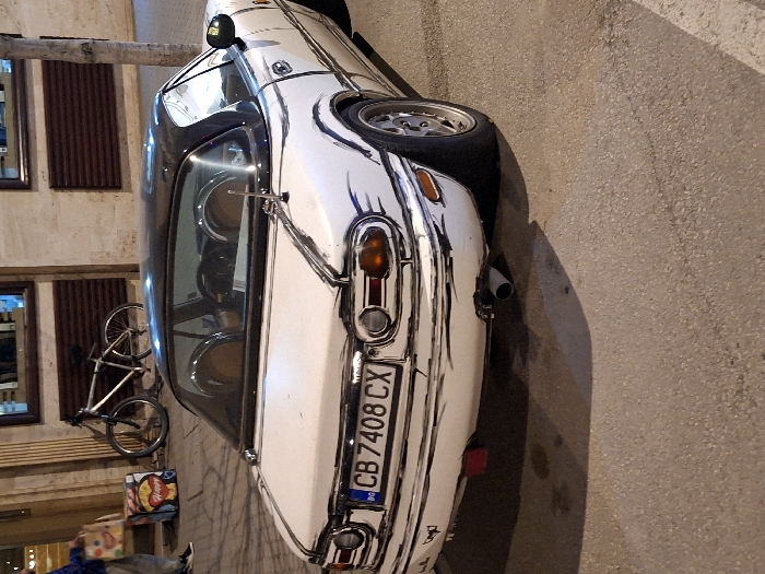 An evening street scene in Sofia, Bulgaria, depicts the rear quarter view of a white Mazda MX-5 (NA generation) convertible with a black hardtop, parked on a paved surface