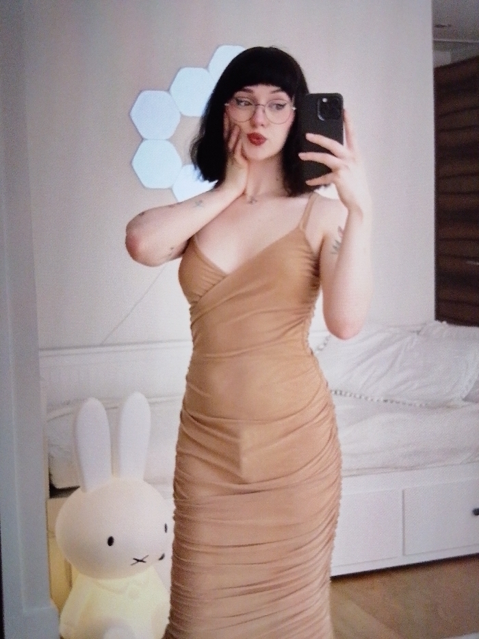 A female individual is depicted indoors, likely in a private residence in Unknown, Unknown. She stands facing a mirror, capturing her reflection with a dark-colored smartphone held in her right hand. The individual possesses short, dark, bob-style hair with bangs, wears circular-framed eyeglasses, and has applied red lipstick. Her left hand is positioned with fingers touching her left cheek, and her mouth is slightly puckered. She is dressed in a light brown (tan), form-fitting, ruched midi-dress with spaghetti straps and a V-neckline. Tattoos are visible on her left forearm and upper right arm. In the background, to her left, a white Miffy bunny lamp or figurine is present on a surface. Behind her, a cluster of five illuminated hexagonal panels is affixed to a plain white wall. To her right, a white bed frame with integrated drawers and a white comforter is visible.